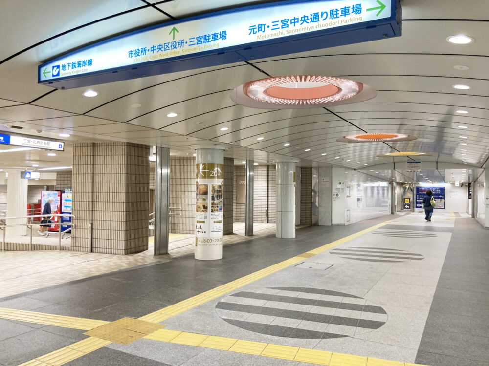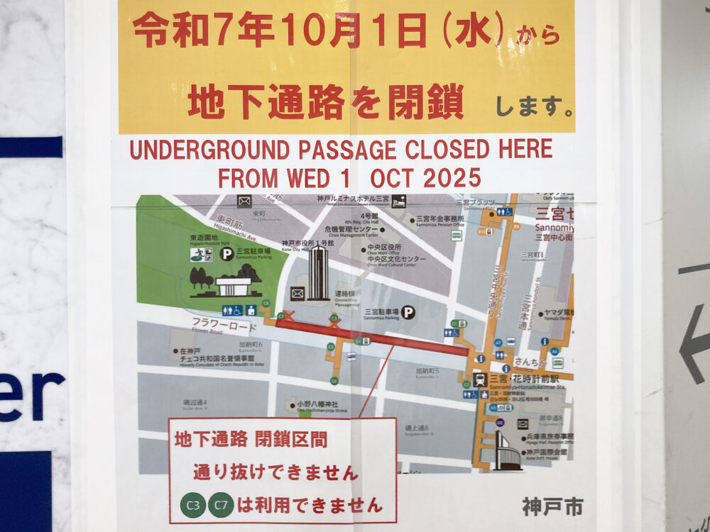 2025年10月1日から閉鎖されたのは、「地下鉄海岸線三宮・花時計前駅」などから海側(東遊園地方面)へと続く約250mの区間です。