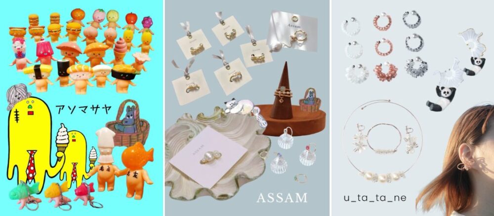 アソマサヤ(フィギュア・イラスト)/ASSAM(アクセサリー)/u_ta_ta_ne(ビーズアクセサリー・布小物)/En.(ポリマークレイアクセサリー)/Oiseaux(レジンアクセサリー)/kanton ajaib(布小物)/KIRARI(アップサイクルアクセサリー)/cutiful(パウンドケーキ)/kuuya(オリジナルキャラグッズ)/*guunin*(羊毛フェルト雑貨)/comecome(焼き菓子)/savon futur(スキンケア・雑貨)/solmu(アクセサリー・洋服)/chuchurichula / chaty’s room💜(リメイク&ハンドメイド服)/tsunagu-te(アクセサリー・帽子・洋服)/夏きこ(イラスト・リクエストペイントWS)/perle de beaute’(布小物)/Hataco(テディベア) ほか