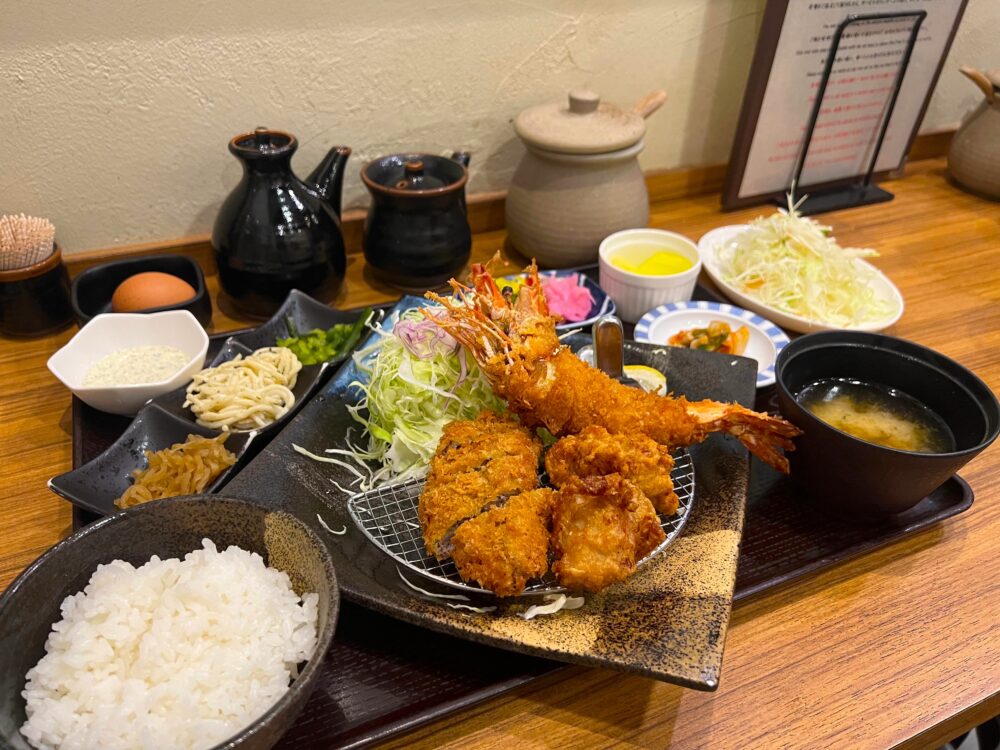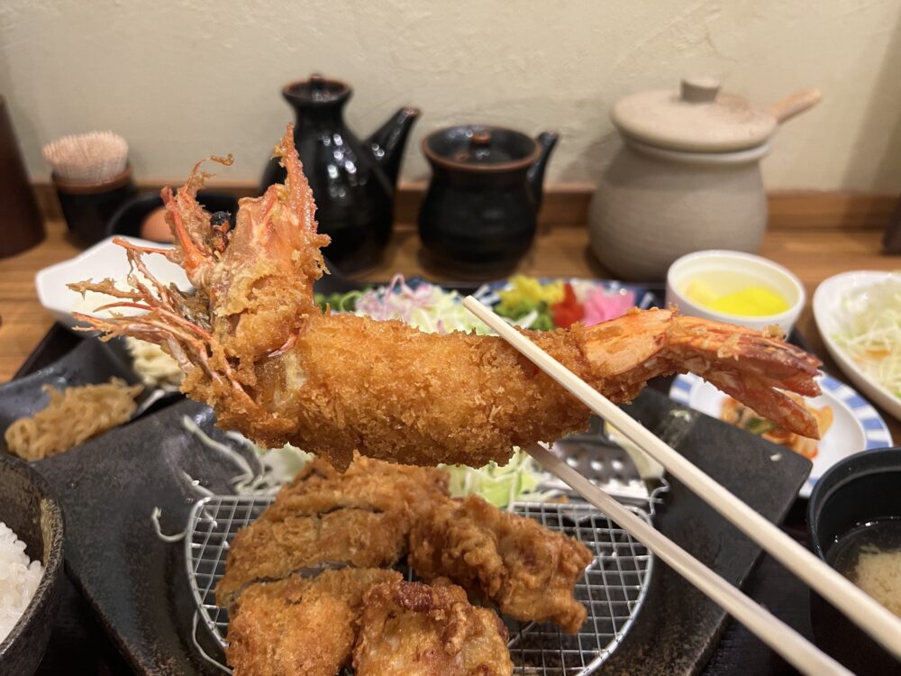 大海老フライ・ひれとんかつ・鶏の唐揚げが少しずつ楽しめるメニューですが、ひとつずつがなかなかのサイズ感で空腹のサラリーマンにはなんともありがたい。