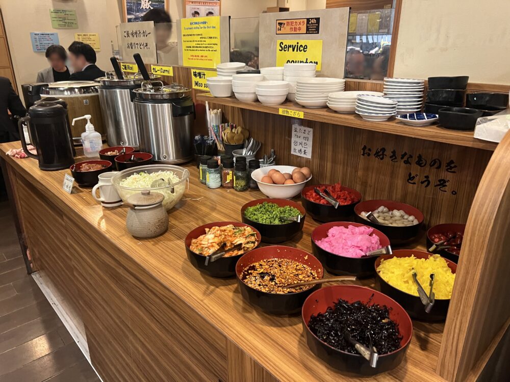 店内には、御飯のお供となる漬け物・キムチ・らっきょ・生卵などが食べ放題。セルフサービスで好きなものを好きなだけ楽しめます。