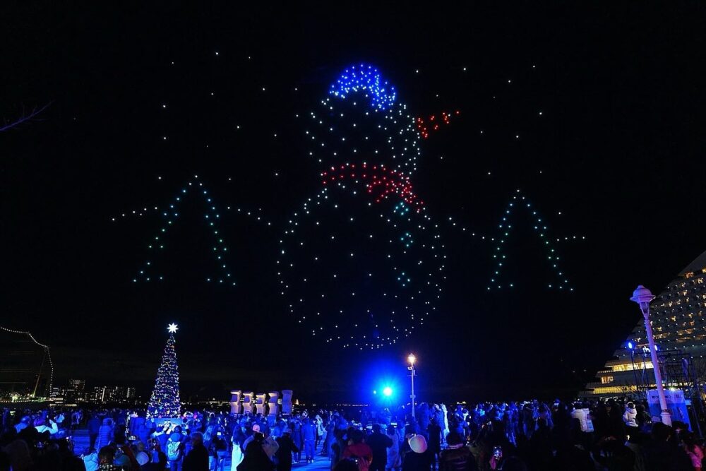 ドローンショーは期間中毎日開催され、18:00~/20:00~の計2回実施。夜空には「サンタクロース」や「雪だるま」などが浮かび上がり、クリスマスが演出されます。メリケンパークのライトアップやポートタワーの光とマッチした景色を堪能できるようです。