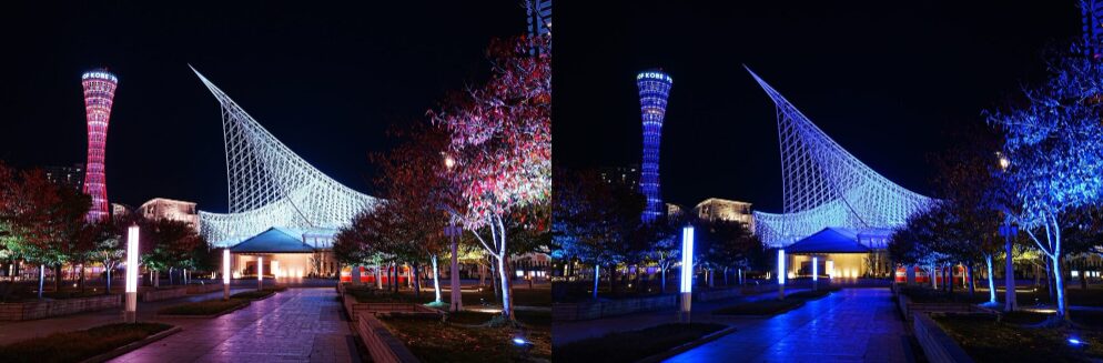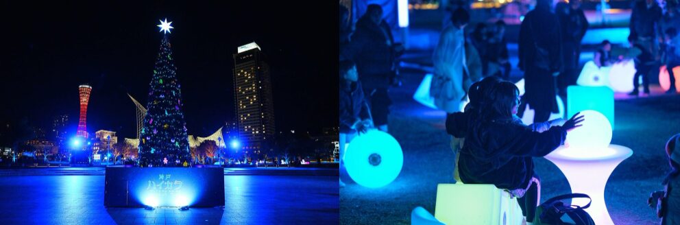 さらに期間中、「神戸ポートタワー」「神戸海洋博物館」「BE KOBEモニュメント」など、メリケンパークが特別ライトアップされます。会場全体が青と白の幻想的な光に包まれ、イルミネーションやツリーとともに幻想的な空間を楽しむことも。