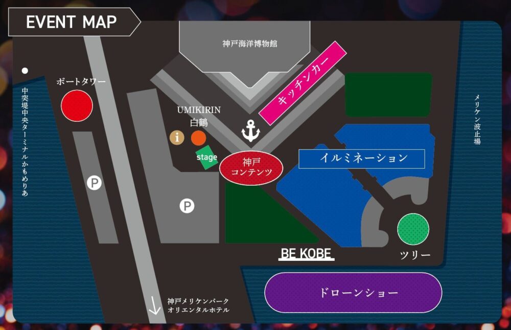 神戸ウォーターフロントの「冬の夜の賑わい創出」を目的としていて、ドローンショーやイルミネーション、キッチンカーなどが登場します。