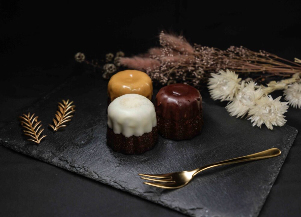 もっちり感を追求した大ぶりのカヌレのトップに、カヌレに合う厳選した3種のフレーバーのチョコレートをコーティング。スイートチョコ、ホワイトチョコ、キャラメルチョコそれぞれのチョコレートとカヌレの絶妙な味のコントラスト、カヌレのもっちり食感を楽しめます。