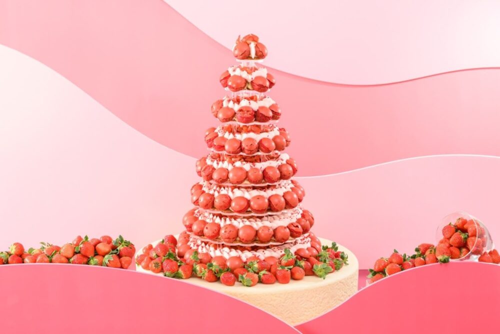 ケーキ、ムース、焼き菓子、ジュレ、ドリンクなど20種ほどの「苺スイーツ」が登場します。また、ディナー限定で「いちごのサントノーレタワー」や、ランチ・ディナーどちらでも楽しめる「こぼれいちご」など、ラインアップは豊富です。