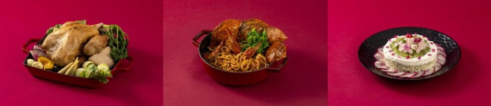 七面鳥のコンフィ ラズベリーソース(左)/渡り蟹のトマトパスタ(中)/蟹とアボカドのクリスマスケーキ仕立て(右)
