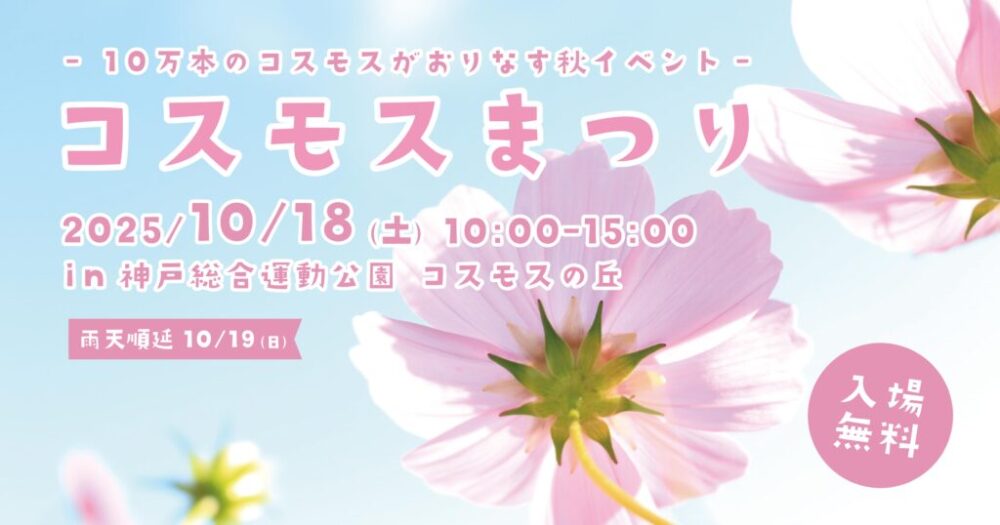 神戸総合運動公園で、約4,000㎡の段々畑の一面に咲く約10万本の「コスモス」が楽しめるイベントが開催されます。