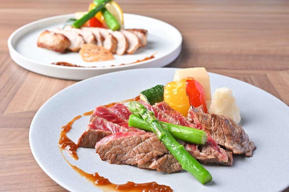 ランチにはポークステーキ、ディナーにはビーフステーキが提供されるとのこと。