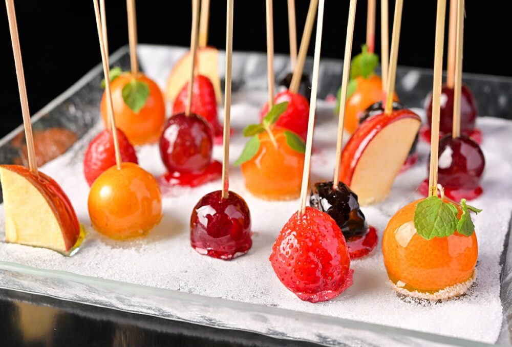 りんご飴をはじめとした、いちご・ぶどう・みかんといったフルーツ飴を、お好みでシナモンシュガー・サイダー・ミルクなどのフレーバーパウダーをまぶしていただけます。縁日でおなじみの昔懐かしい「屋台の甘味」で、お正月のお祭り気分を味わえそうです。