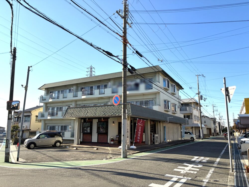 交差点の角にある集合住宅の1階部分がお店になっています。近くには「清水ヶ丘」ってバス停もあります。