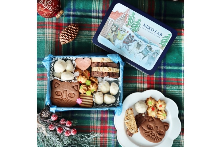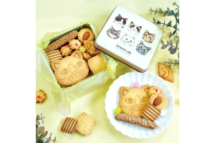 ちょっとした贈り物にもぴったりな中缶サイズです。愛らしい猫顔のクッキーはNEKO LABオリジナルのクッキー型で焼きあげました。バラエティに富んだ数種のクッキーと、彩り豊かな金平糖がぎっしりと詰め込まれています。