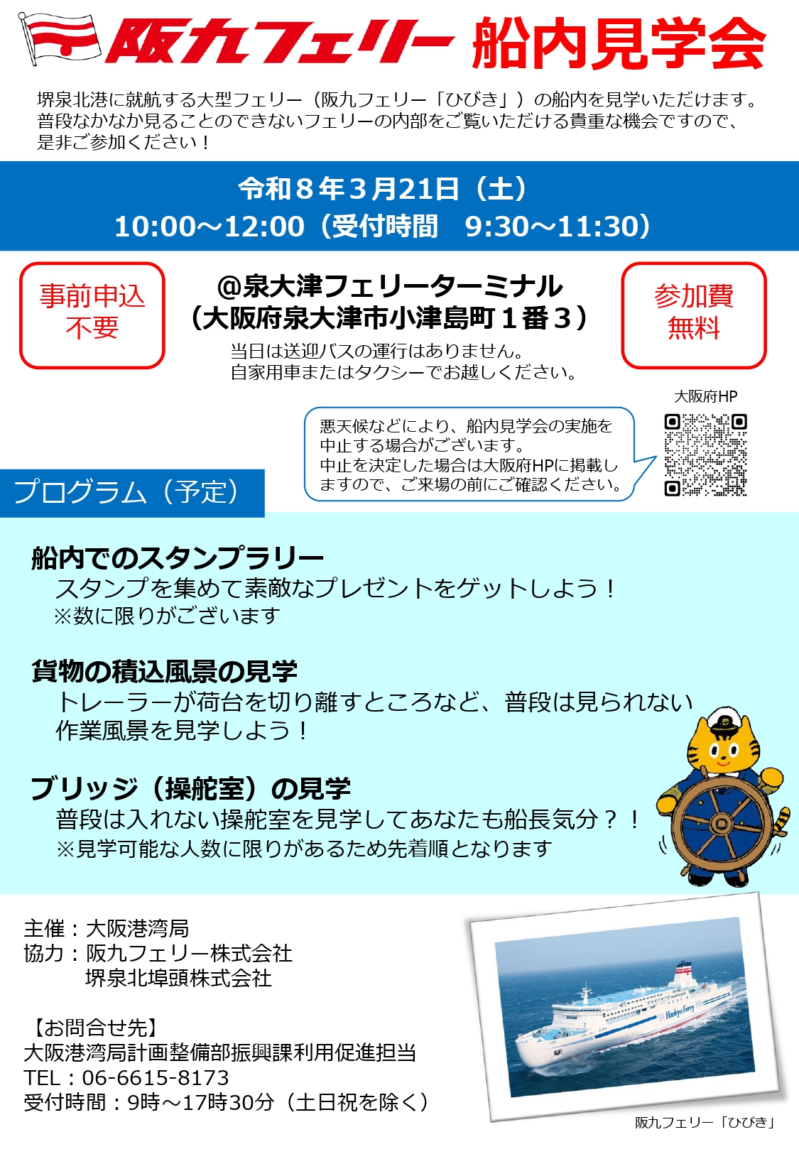 ・中止を決定した場合は大阪港湾局ホームページおよび阪九フェリー株式会社ホームページに掲載します。