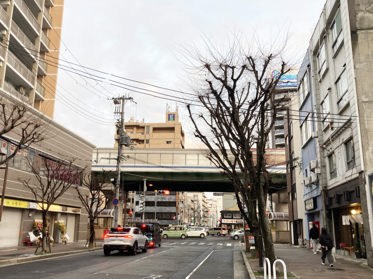 南を向くと国道2号線がすぐで、阪神高速の高架が見えます。2025年5月にオープンした居酒屋「オムロ」の斜め向かいです。