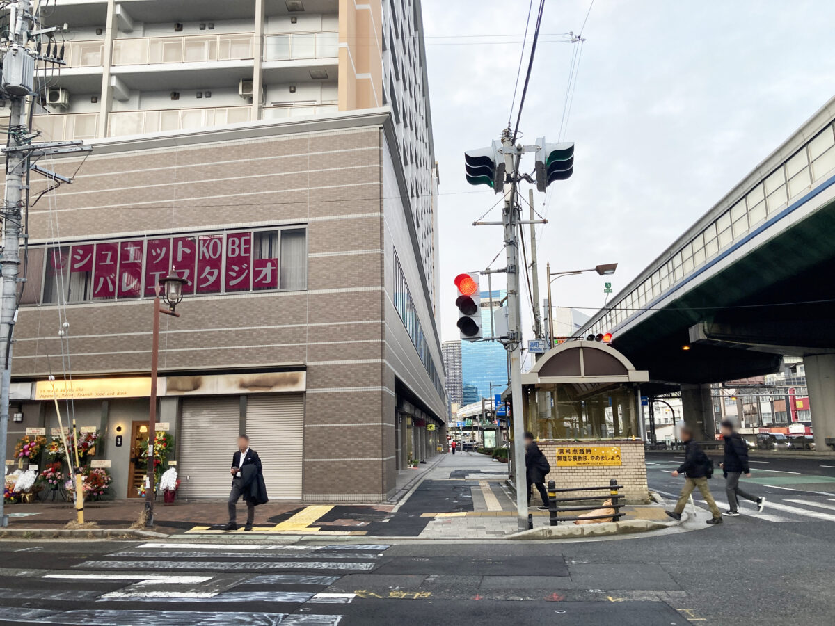 神戸駅の方を見るとこんな感じ。「洋食の藤」や「BB Bakery」などが入る相生ビルの南側です。交差点には少し前に閉鎖された「湊町地下道」があります。