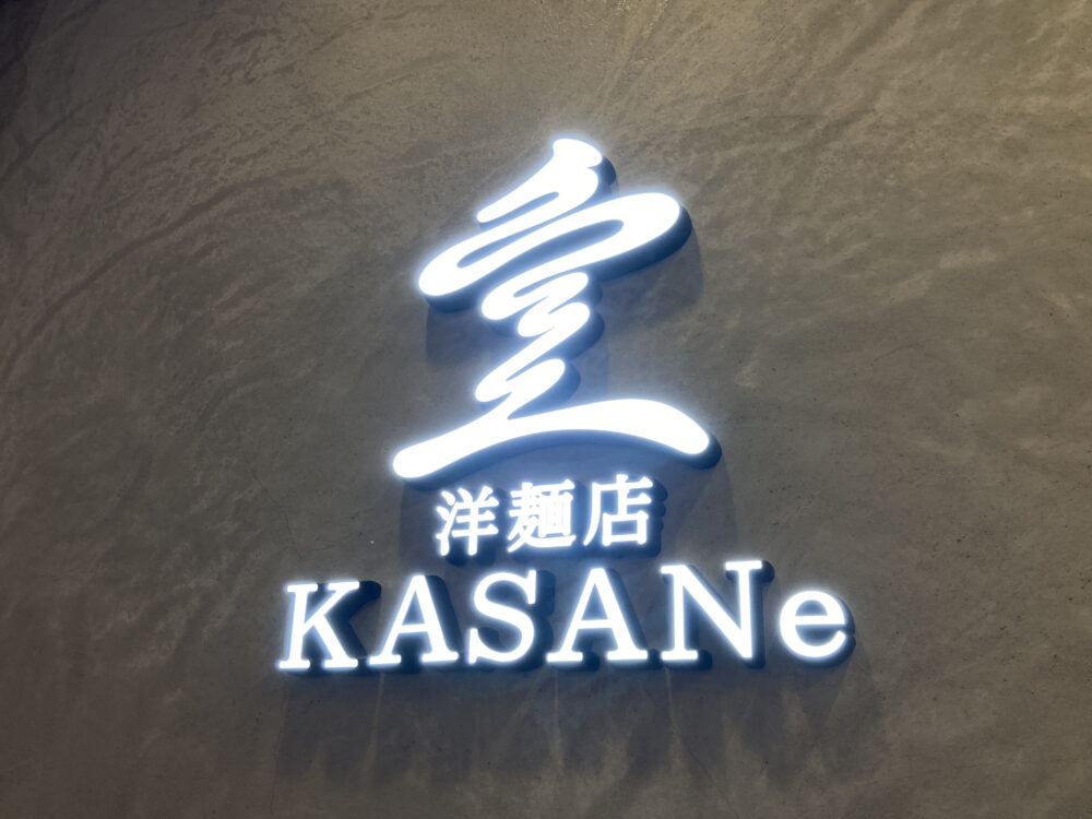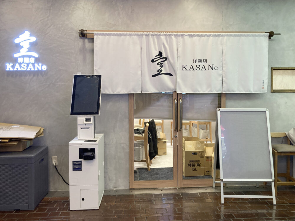 印象的な白いネオンが光る『洋麺店KASANe』。11月上旬の段階で「暖簾」がかかり、真新しい精算機や看板の準備が進められていました。