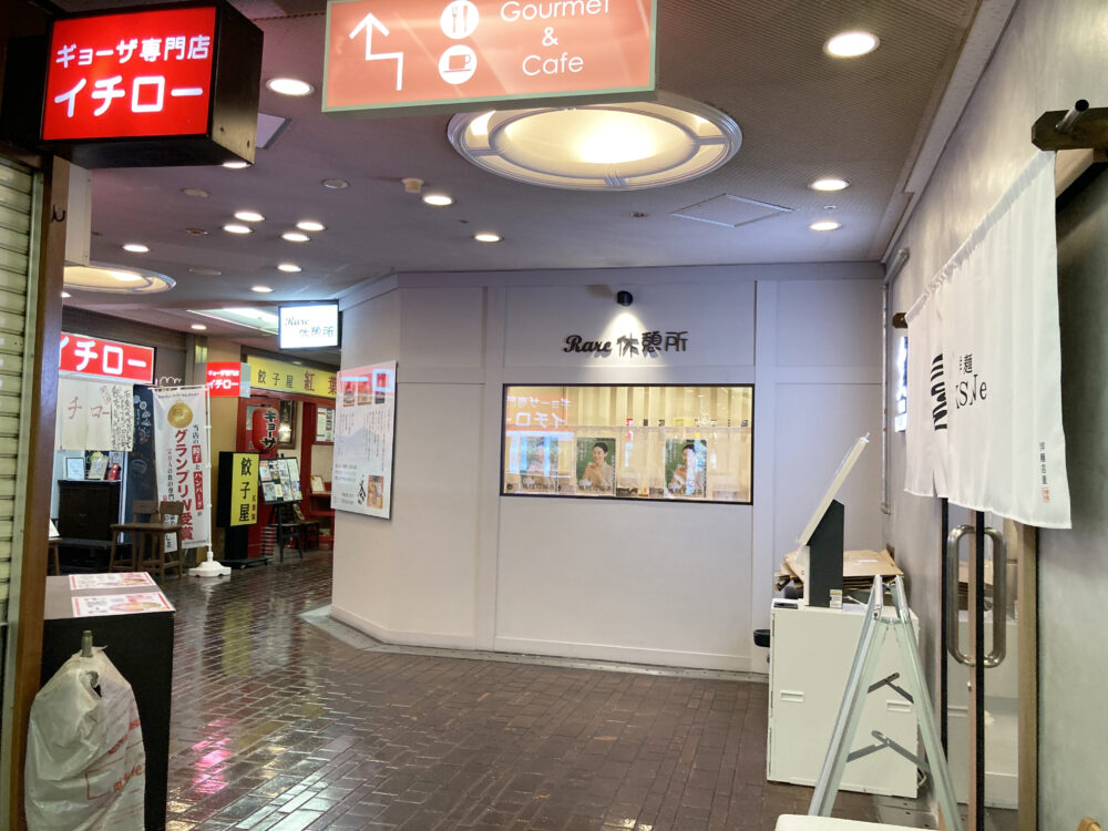白い暖簾が架かった店舗で、通路が少し曲がったところにあり、ギョーザ専門店「イチロー」の前あたり。