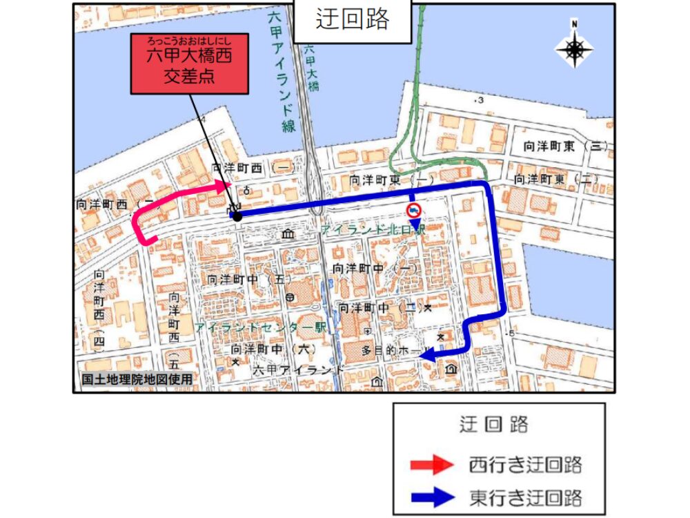 六甲アイランドの一部区間で『交通形態』の変更が行われます。大阪湾岸道路西伸部の橋梁工事に伴っての変更で、期間は約2年間です。
