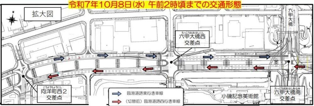 対象となるのは、六甲大橋南交差点〜向洋町西2交差点の間。「小磯記念美術館」の北側になります。
