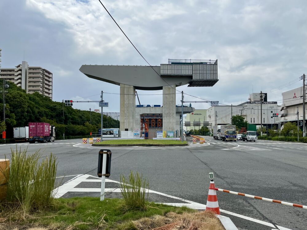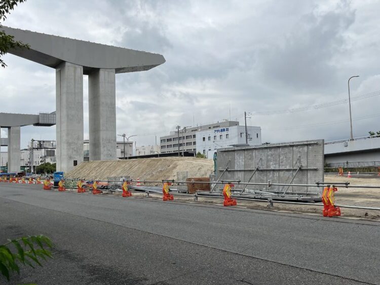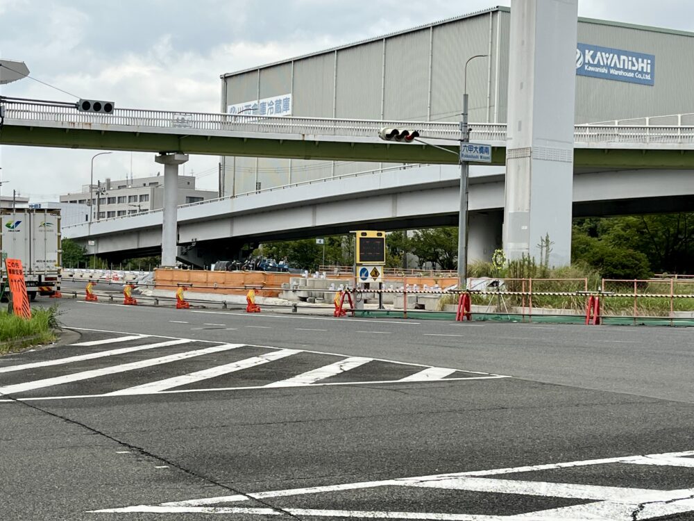 「六甲大橋南交差点」から西を向くとこんな感じ。現在すでに工事中ですが、西方面に向かう際はこの交差点から通路が切り替わり、東行き車線と対面通行することになります。