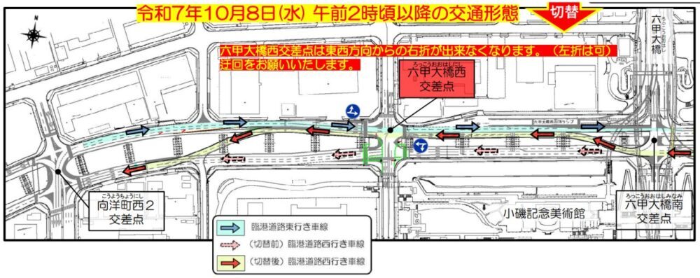 さらに「六甲大橋西交差点」では、東西方向どちらからも右折禁止となります。