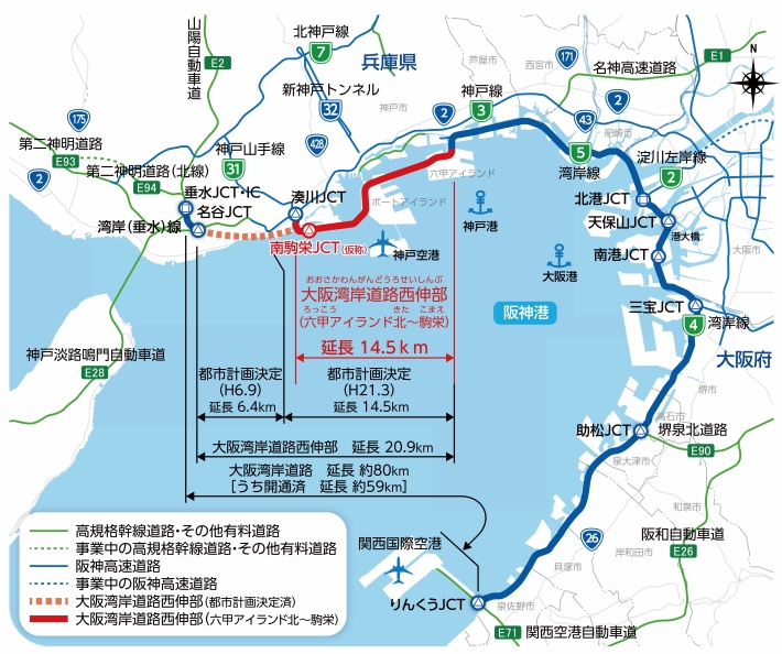 今回対象となるのは、垂水ジャンクション~関空までを結ぶ約80kmの自動車専用道路「大阪湾岸道路」の一部区間である「大阪湾岸道路西伸部(六甲アイランド北~駒栄)」。