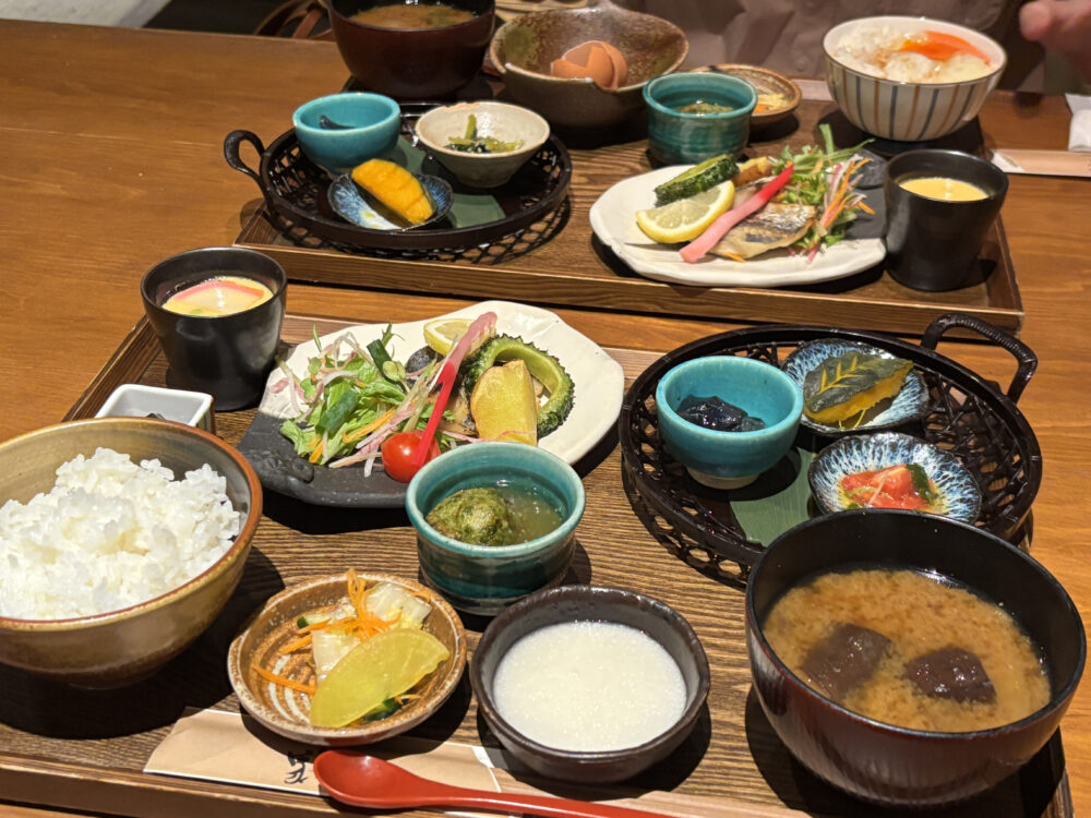 今回は「日替わり農家御前(税込1,750円)」で、主菜は「鰆の西京焼き」をチョイス。旬の野菜を使った「おばんざい」や、やさしい味の「茶碗蒸し」、お店の定番「おくらまんじゅう」など、6種類の小鉢がセットになっています。