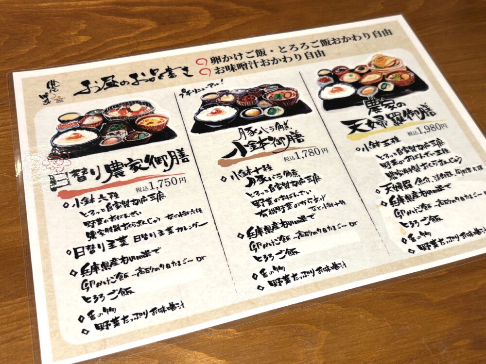 ランチメニューには「日替わり農家御前」「豚バラ角煮 小鉢御膳」「農家の天婦羅御膳」などがあり、それぞれ小鉢が5~10種ほどついて1,800円前後です。