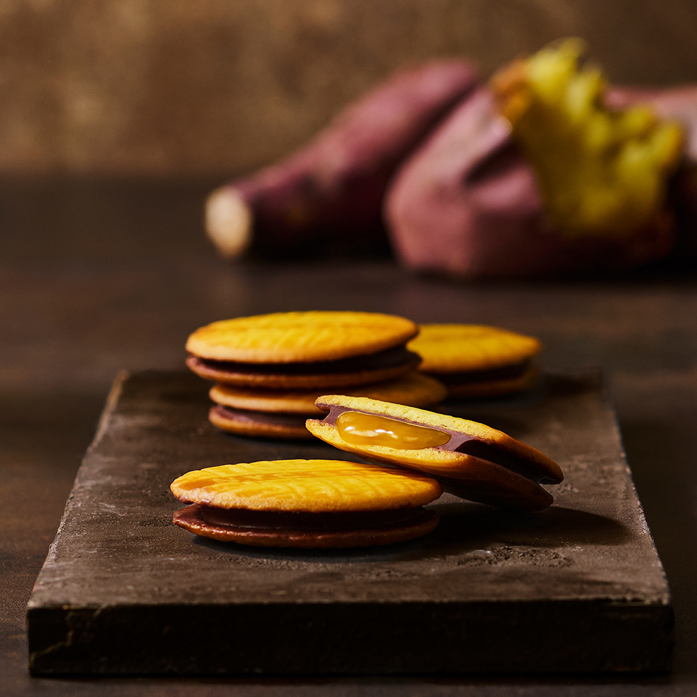 さつま芋のパウダーとペーストを混ぜ合わせて、バターと生クリームで香り高く炊き上げたとろけるキャラメルをミルクチョコレートで包み込み、さつま芋の香り豊かなバタークッキーでサンドしています。
