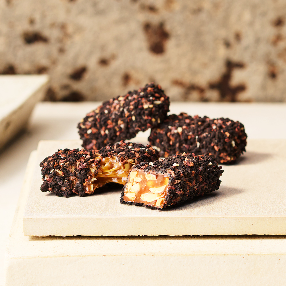 バターや生クリーム、蜂蜜を使って炊き上げたキャラメルヌガーにローストアーモンドを混ぜ込み、ミルクチョコレートをコーティング。