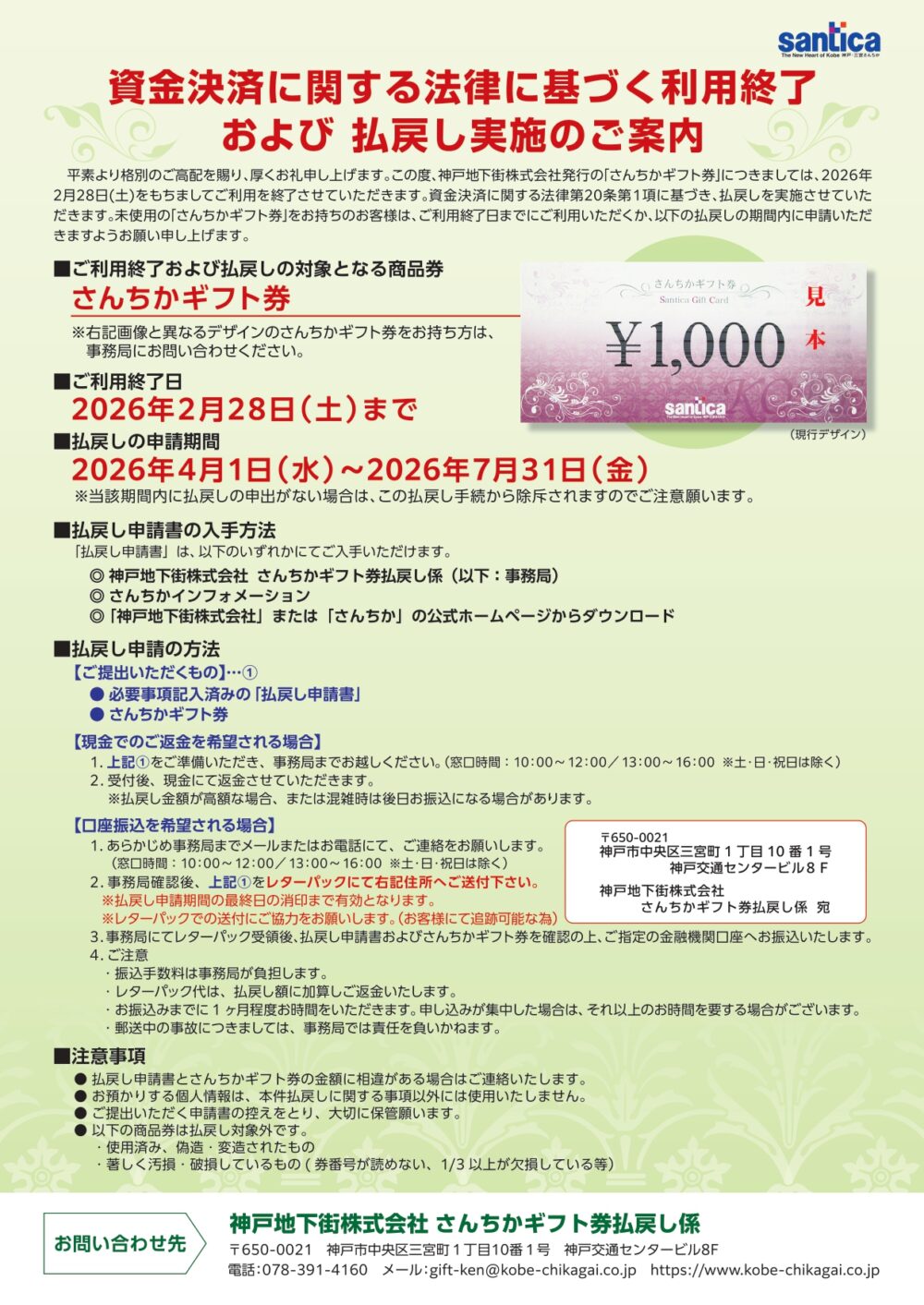 神戸地下街株式会社が発行する「さんちかギフト券」は、2026年2月28日(土)をもって取り扱いを終了することになったそうです。