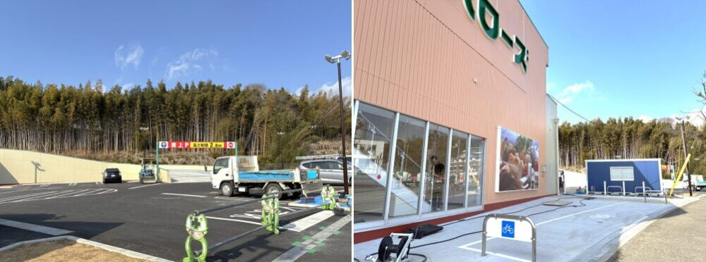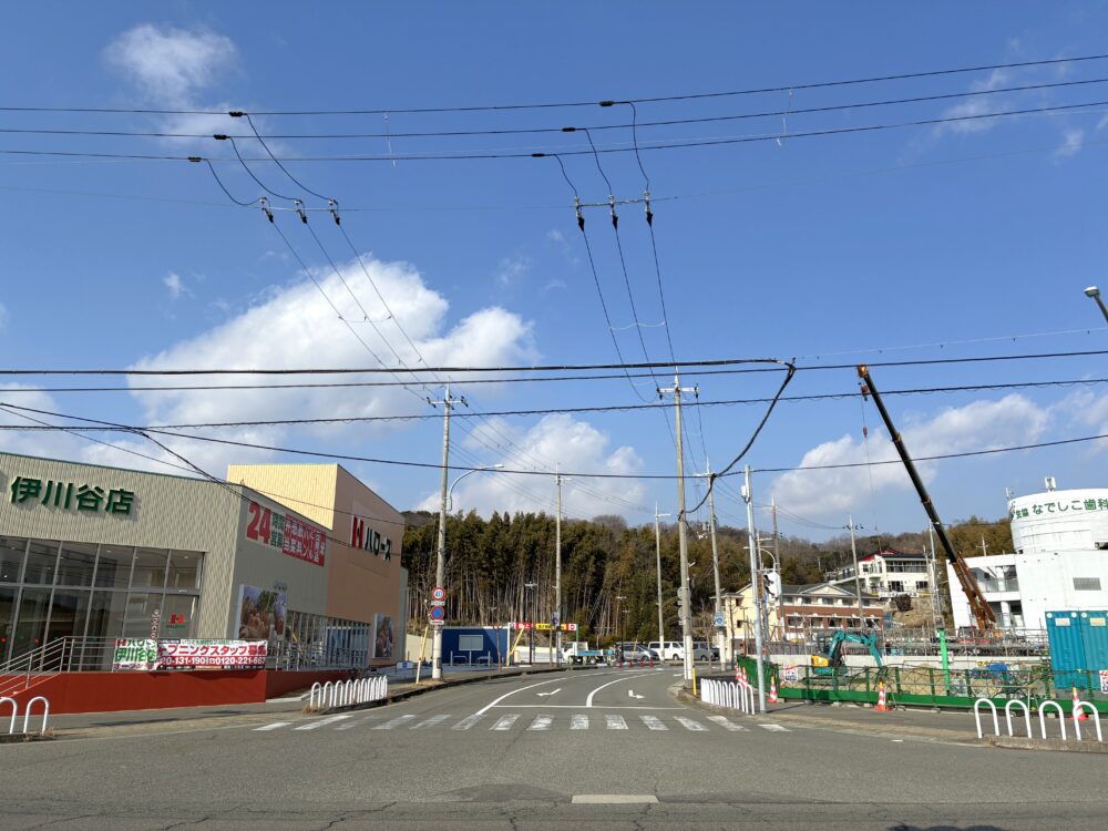 お店ができたのは以前まで、ホームセンター「ロイヤルプロ 伊川谷」があった場所。建物は取り壊すことなく活用されたので形などに大きな変化はありませんが、外壁などはきれいになりお店のロゴもつきました。道路を挟んだ向かい側は「マンション」建設に向けて工事中。