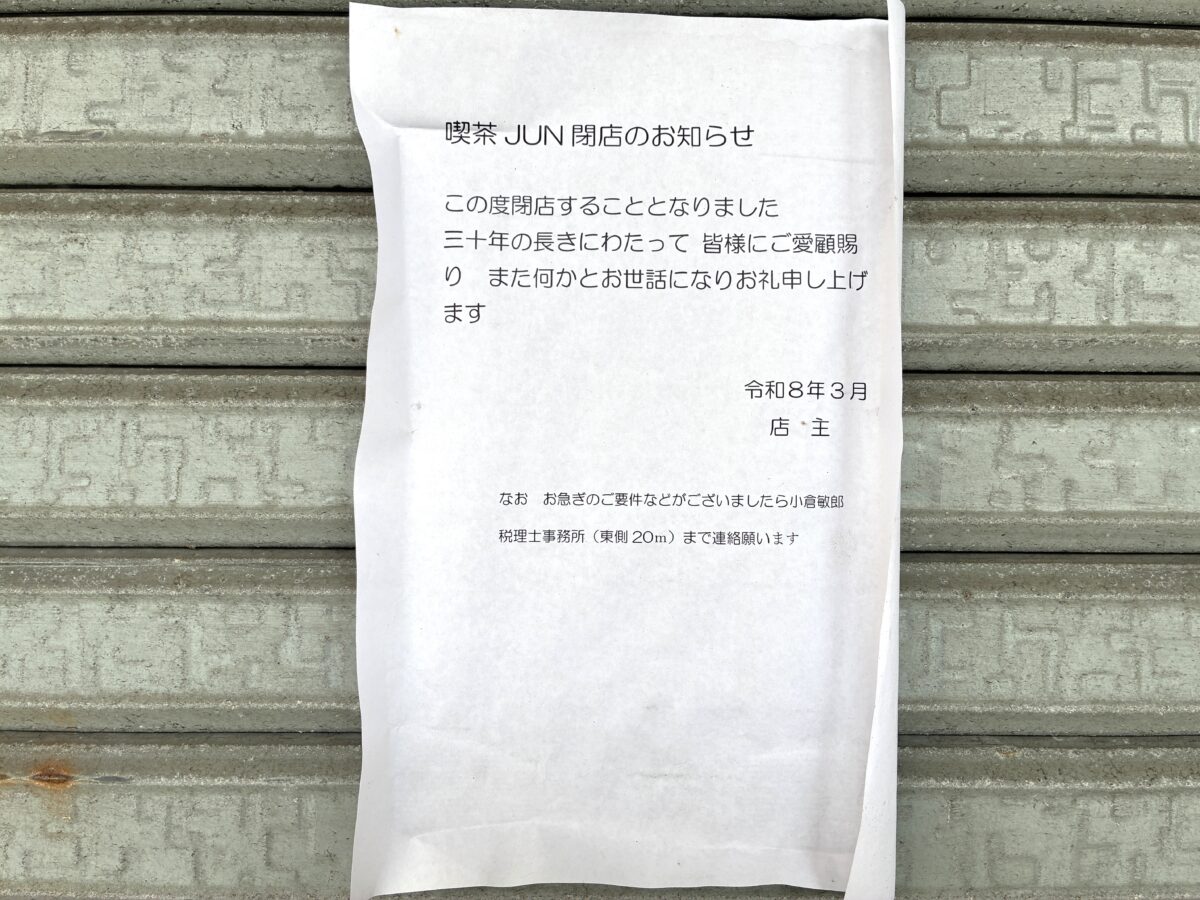 JR明石駅から南へ10分ほどの場所にある老舗の喫茶店『Jun(ジュン)』が閉店してます。