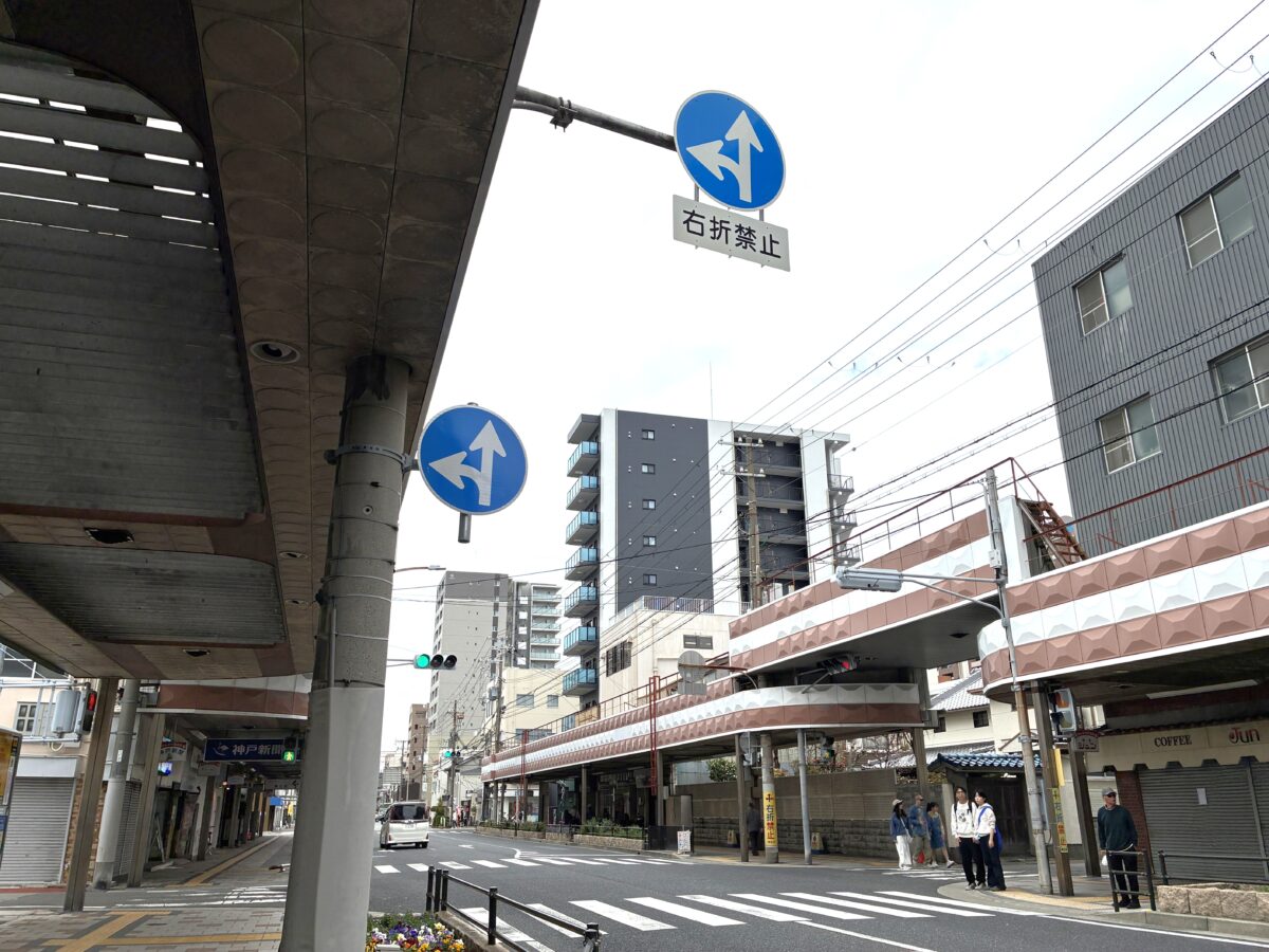 お店があるのは「魚の棚商店街」より2本ほど南の通り沿い。商店街のある北側を向くとこんな感じで、少し進むと「明石玉子焼 中々」や「まじめや明石店」という居酒屋さんがあります。
