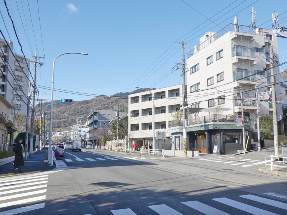 お店の場所は、阪急 六甲駅からは歩いて5分くらいのところ。お店の西側には神戸六甲線、将軍通線・山麓線が交わる大きな交差点があります。