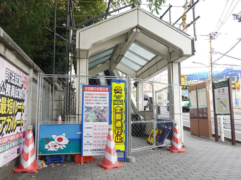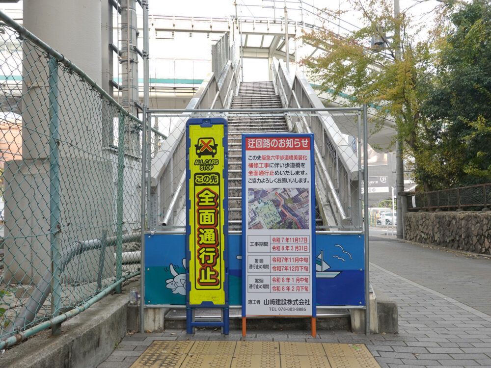 阪急六甲駅に続く「歩道橋」が、美装化補修工事に伴い『全面通行止め』となっています。通行止めは、期間を分けて「二度」行われるみたい。