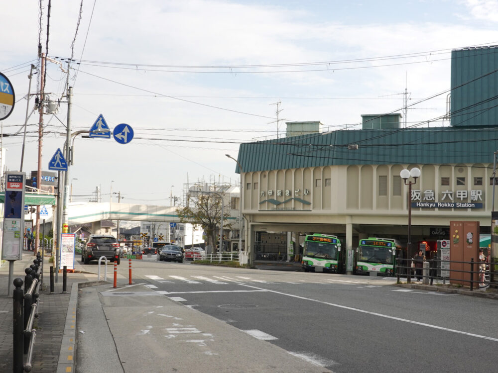 阪急六甲駅へ行く場合は、バス乗り場の近くにあるエスカレータを利用するか、南側のエレベーターを利用してください。