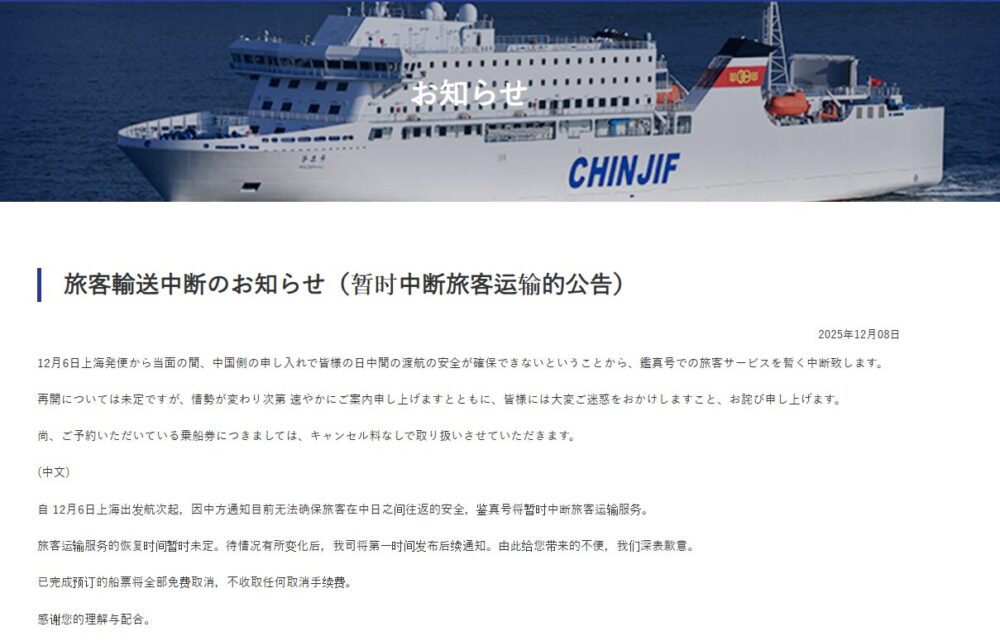 国内唯一の中国との国際フェリーが、2025年12月6日(土)から「旅客サービス」を取りやめてます。
