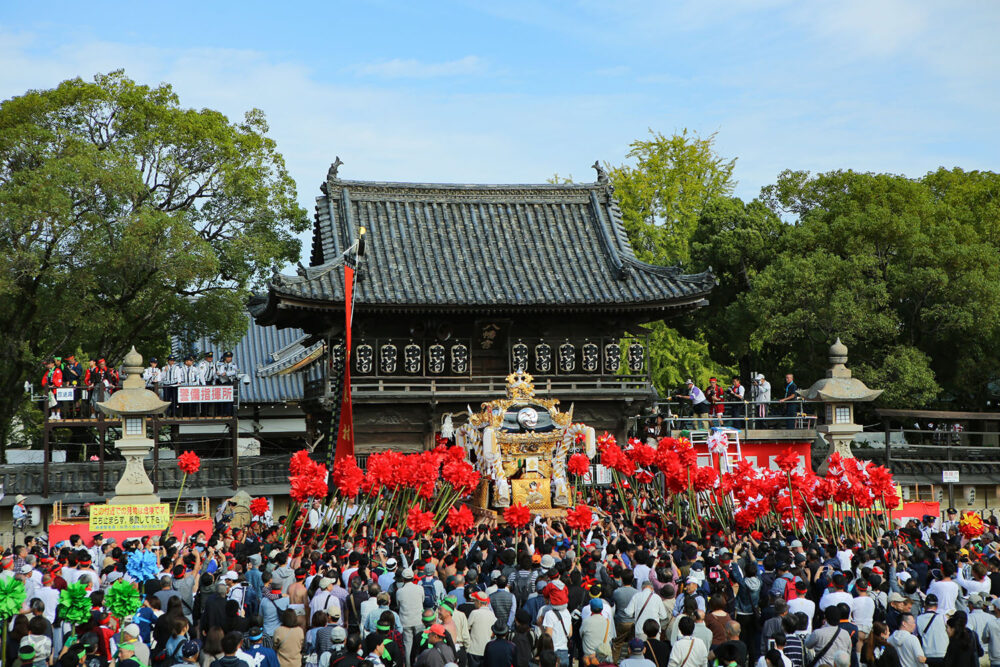 播州地方最大の秋祭り『灘のけんか祭り』では、3基の神輿をぶつけ合い、7台の絢爛豪華な屋台が練り合います。