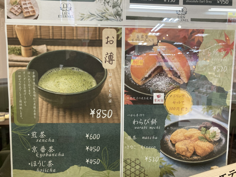 和なカフェメニューも揃っていて、京都字治の製茶場から直接仕入れた香り豊かな「茶葉」を使った「お薄」は一杯ずつ点ててくれるそう。