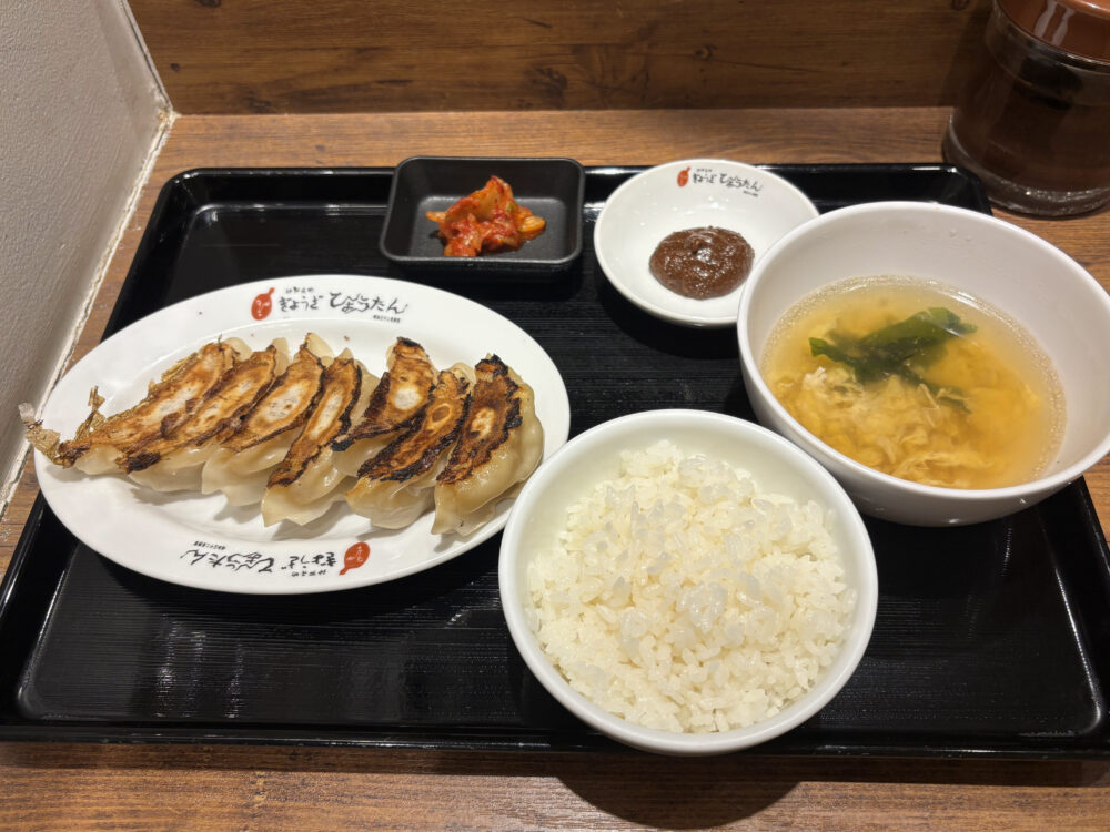 ぎょうざ定食は通常「14個」餃子入っていますが、今回は手ごろな価格の「小(餃子7個・880円)」をチョイス。ご飯・キムチ・スープがセットです。