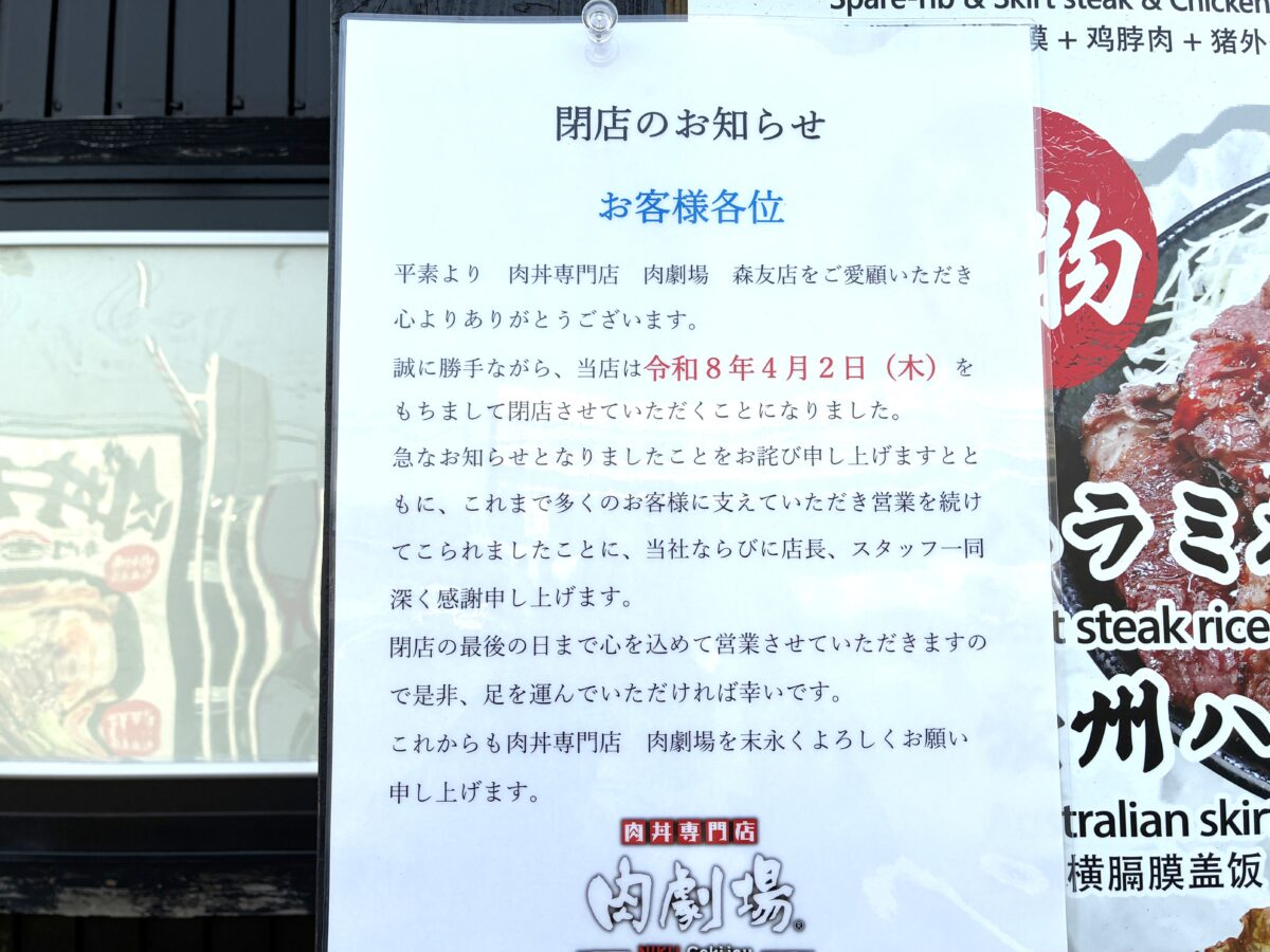 西区・森友にある『肉劇場 番外』って肉丼専門店が閉店するみたいです。