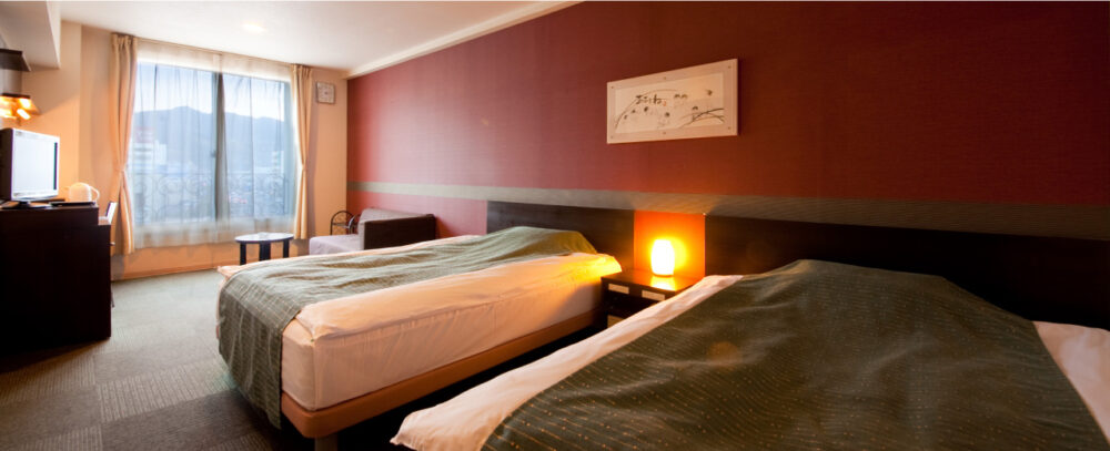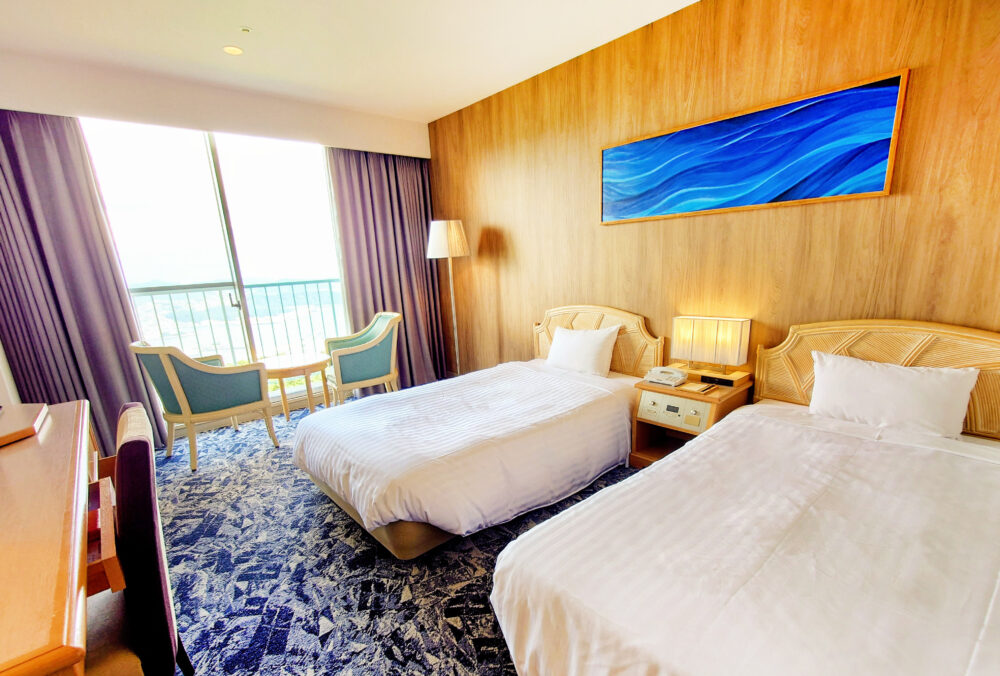 佐世保市の弓張の丘ホテルを選択した場合は、2025年3月にリニューアルされた「ツインルーム」が用意されます。国立公園九十九島と佐世保の夜景を見下ろせる弓張温泉も楽しめるみたい。