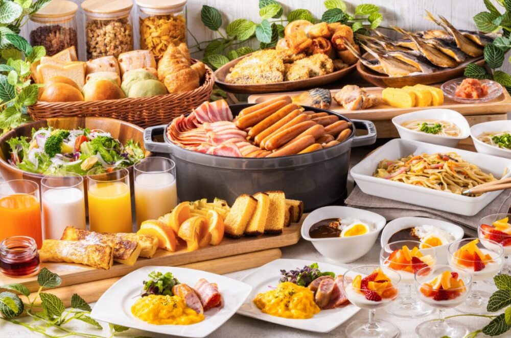 朝食では食べ応えのある厚切りベーコンを挟んだイングリッシュマフィン、野菜たっぷりのミネストローネなどを楽しめます。大分蘭王の温泉たまごもラインナップ。