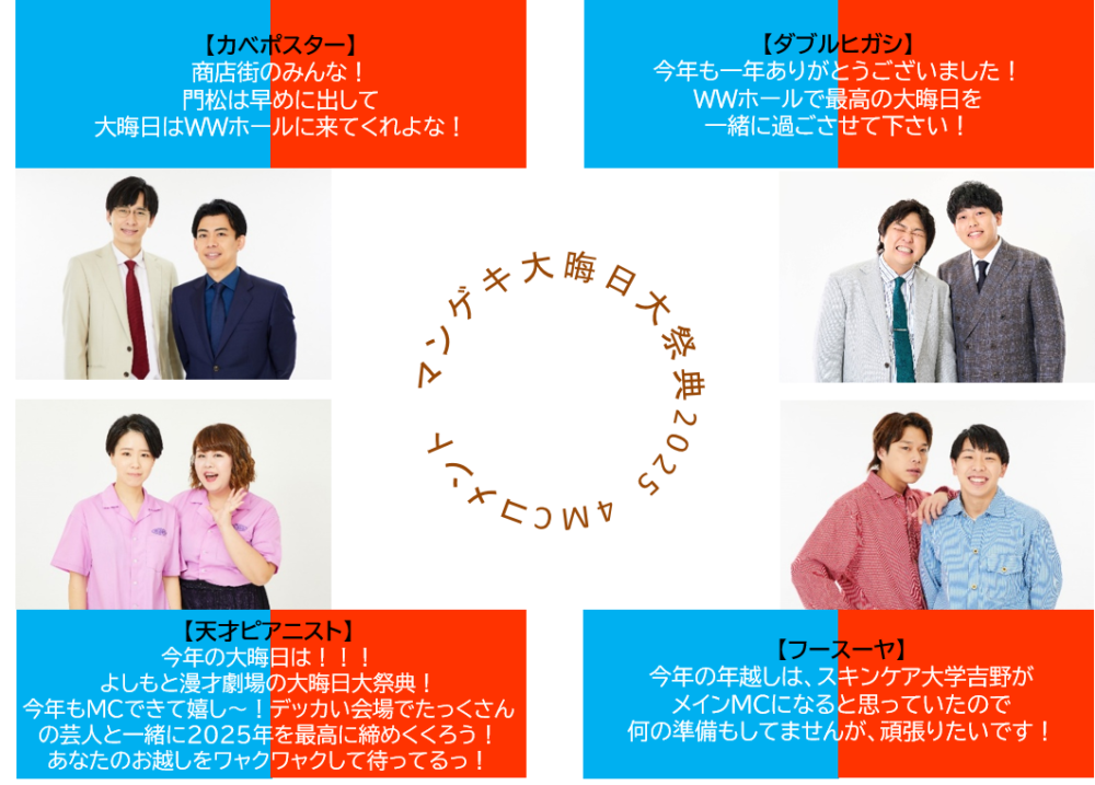 今年のマンゲキ「大晦日大祭典2025」は、“ボケVSツッコミ”をテーマに青組と赤組に分かれて、カベポスター・天才ピアニスト・ダブルヒガシ・フースーヤの4MCが激しいバトルを繰り広げるそうです。