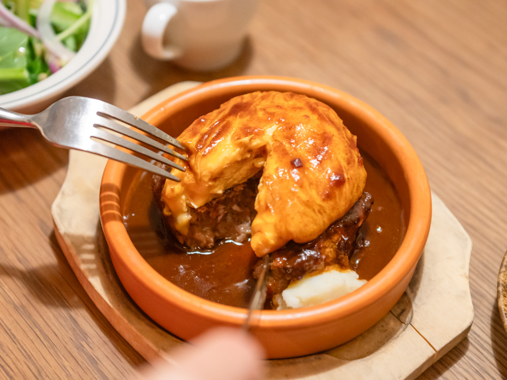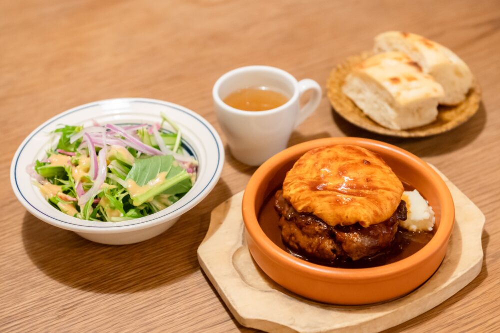 ハンバーグにナイフを入れると、肉汁がじんわり。濃厚なデミグラスソースや、付け合わせのマッシュポテトとからめながら、お肉の旨みをゆっくりと味わい、ランチタイムを楽しみます。