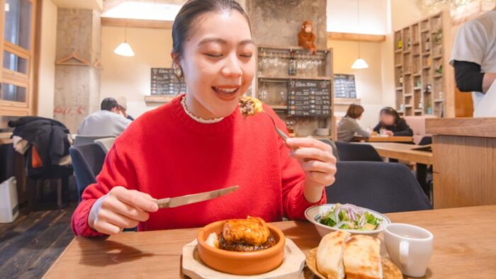 それではいただきます。ふわとろオムレツとハンバーグの相性がバッチリで、美味しい!国産黒毛和牛A5ランクのお肉使用のリッチなハンバーグに、卵のまろやかさがマッチしています。