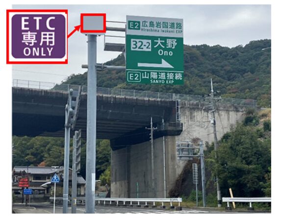 ETC専用料金所の運用開始に合わせ、インターチェンジ付近の高速道路本線及び一般道の案内標識に、ETC専用の標示板を設置し、ETC車で利用する必要があることがお知らせされます。