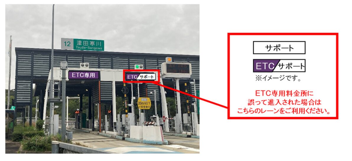 ETCが使えない状態の車両(ETC車載器を搭載していない車両やETCカード未挿入の車両等)で、誤ってETC専用料金所を利用した場合は、後退・転回せずに「サポート」または「ETC/サポート」と表示されたレーンに進み、一旦停止してインターホン等による係員の指示に従ってくださいとのこと。