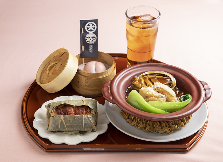 桜鯛とアワビのオイスターソース、うなぎの蓮の葉包みご飯、桃饅頭、ソフトドリンク