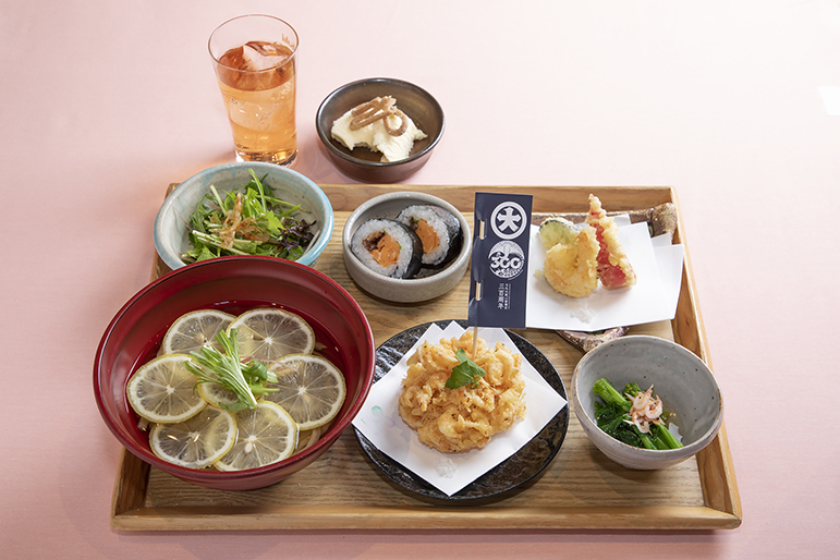 桜えびと菜の花おひたし、桜えびのフレークサラダ、太巻き寿司2カン、天ぷら(桜えびのかき揚げ、海老、野菜×2)、レモンうどん 冷 or 温、うどんチップをかけたアイスクリーム、桜ジュース